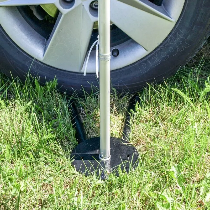 Auton painolla kiinnitettävä lipunjalka. Asennetaan auton pyörän alle. Soveltuu erinomaisesti käytettäväksi ulkotapahtumien yhteydessä.