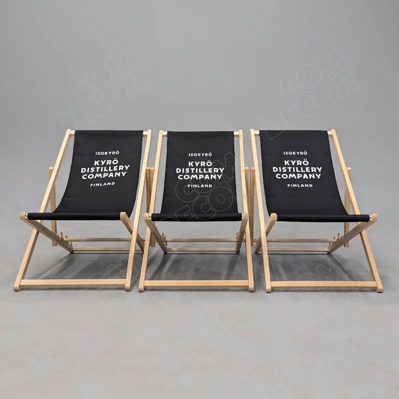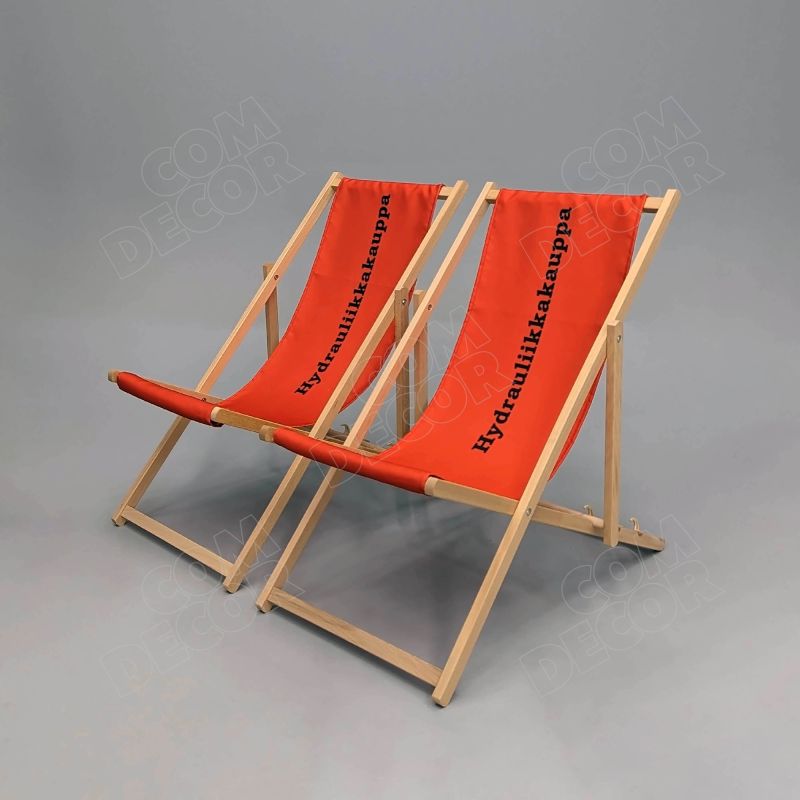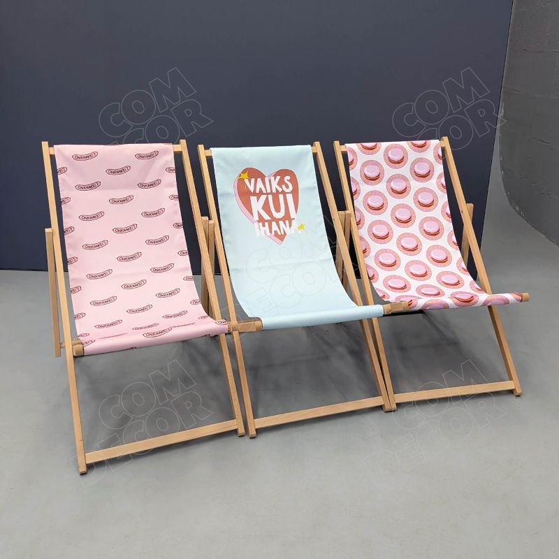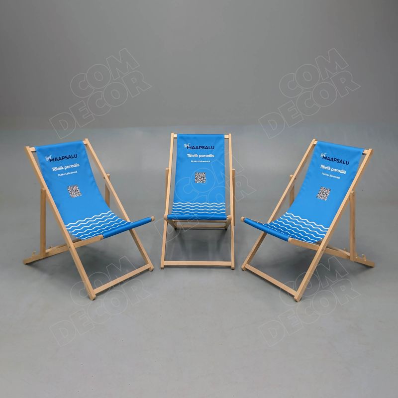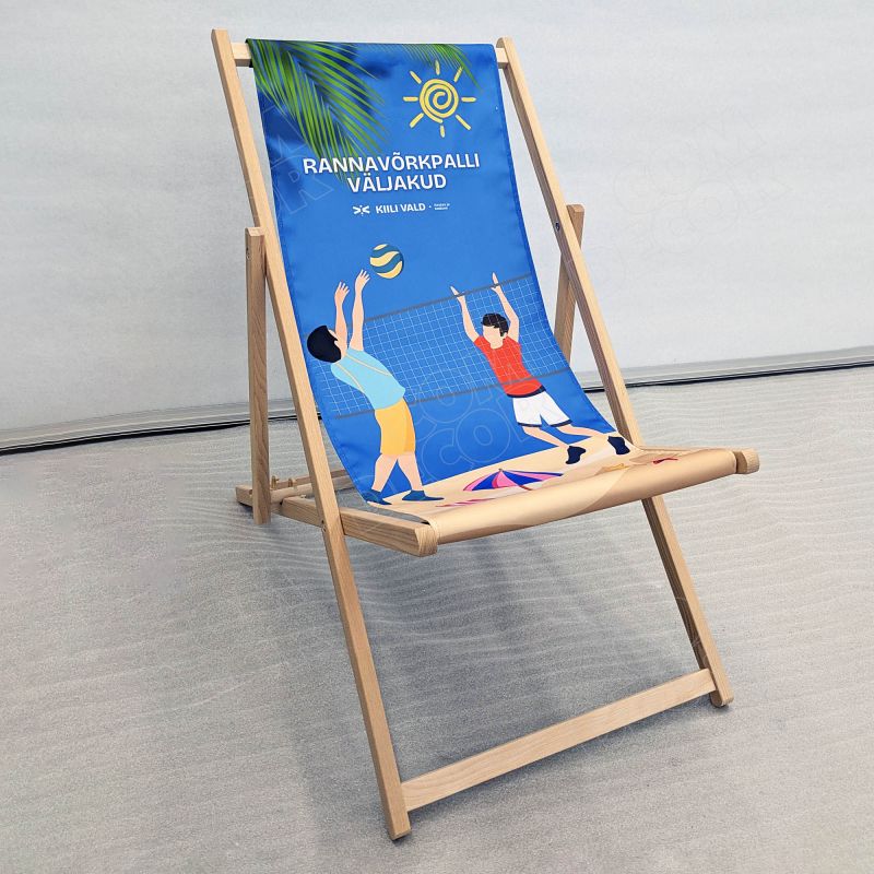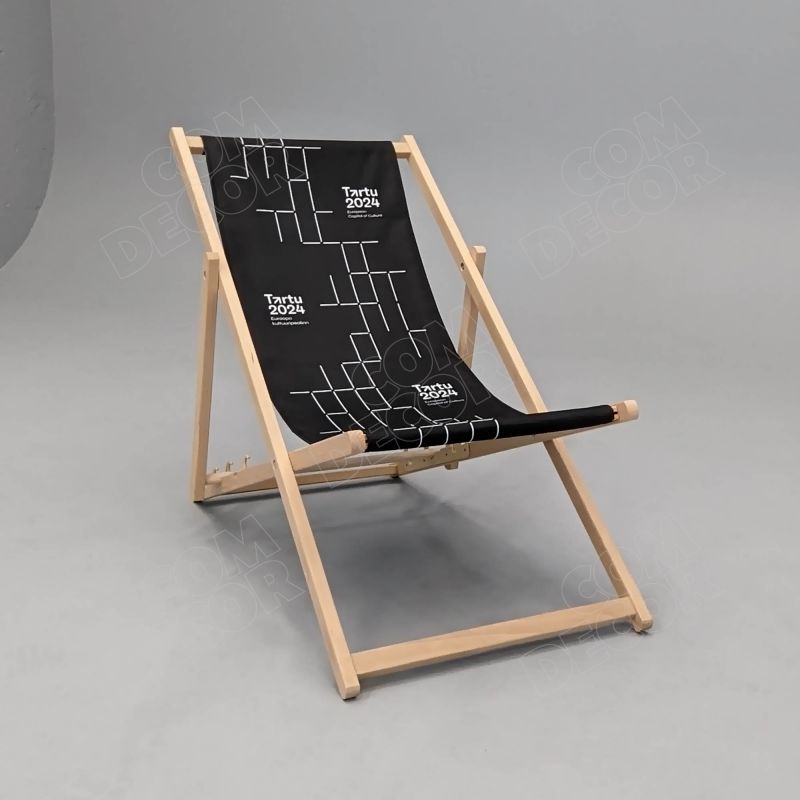 Puitraamiga ja kangast istmeosaga lamamistool. Kangale trükitakse kliendi kujundus või bränding. Lamamistooli kõrgus on reguleeritav.