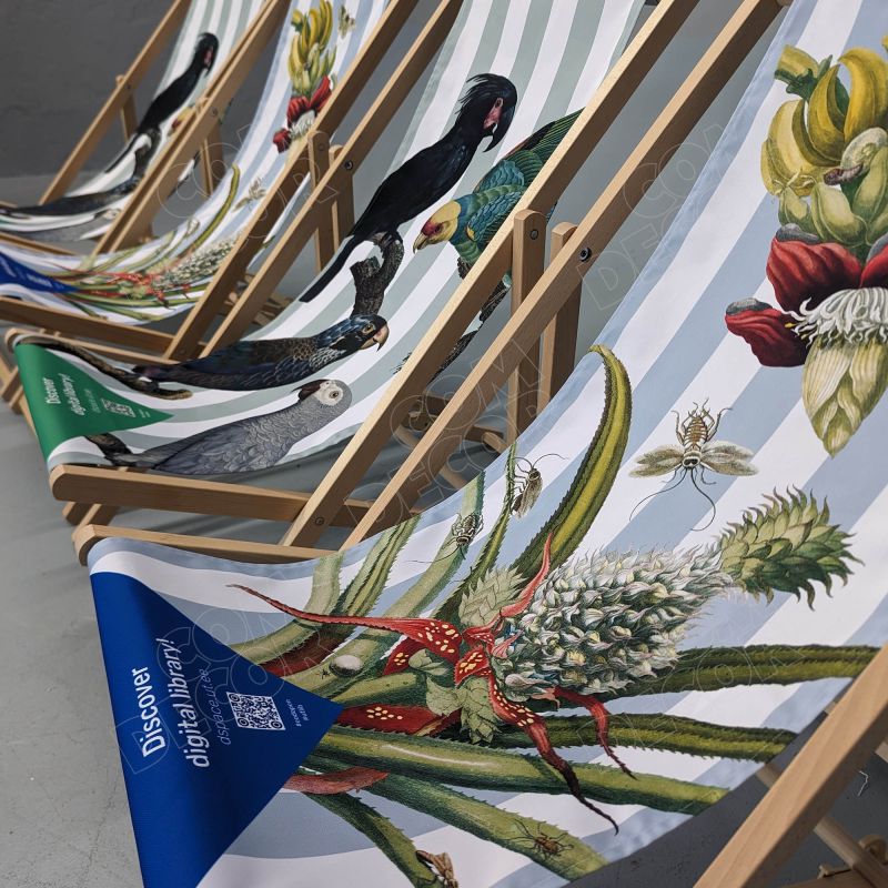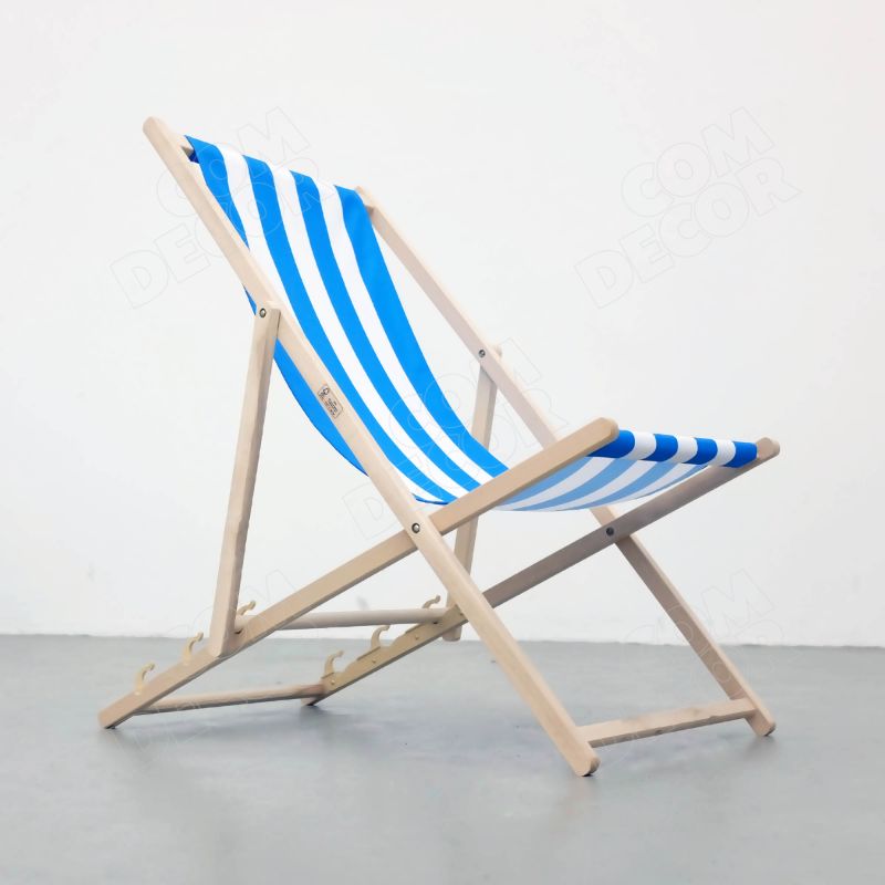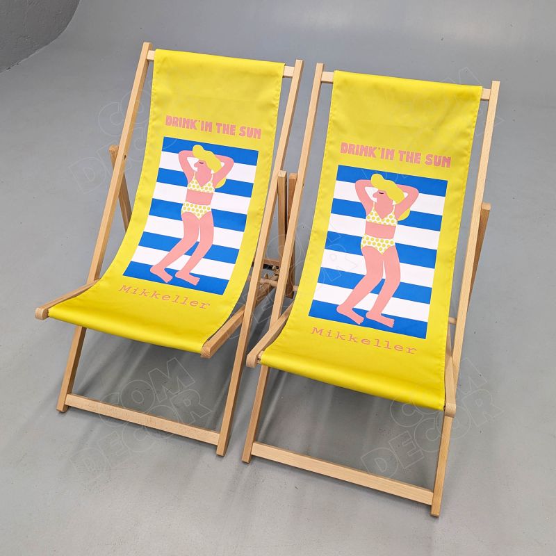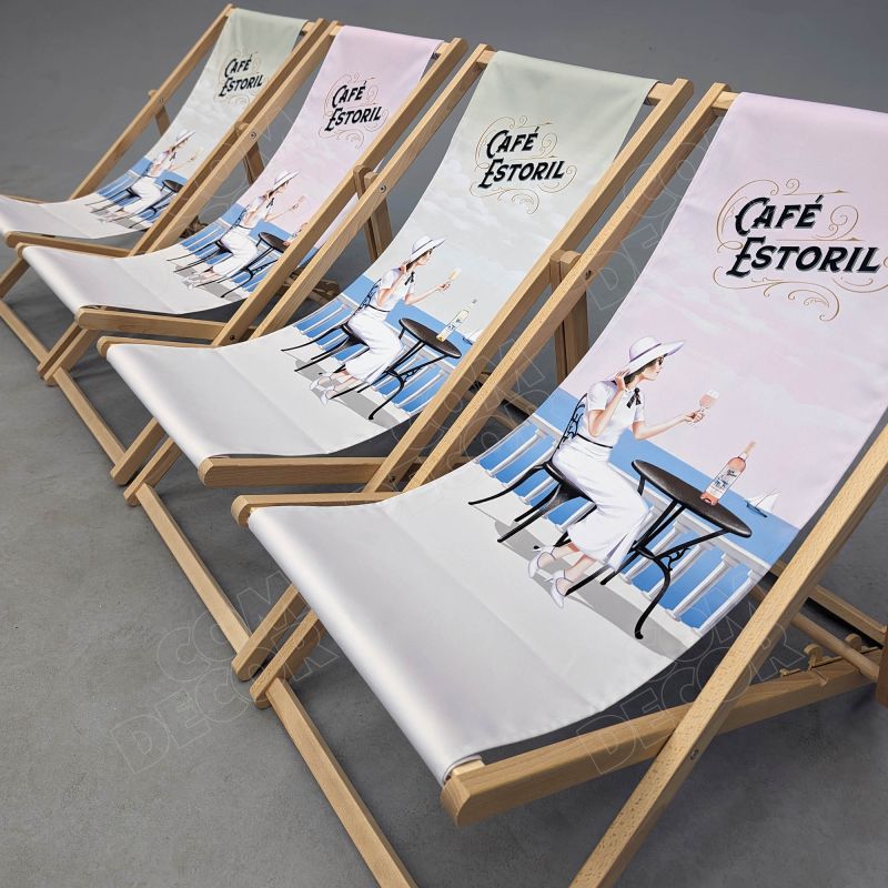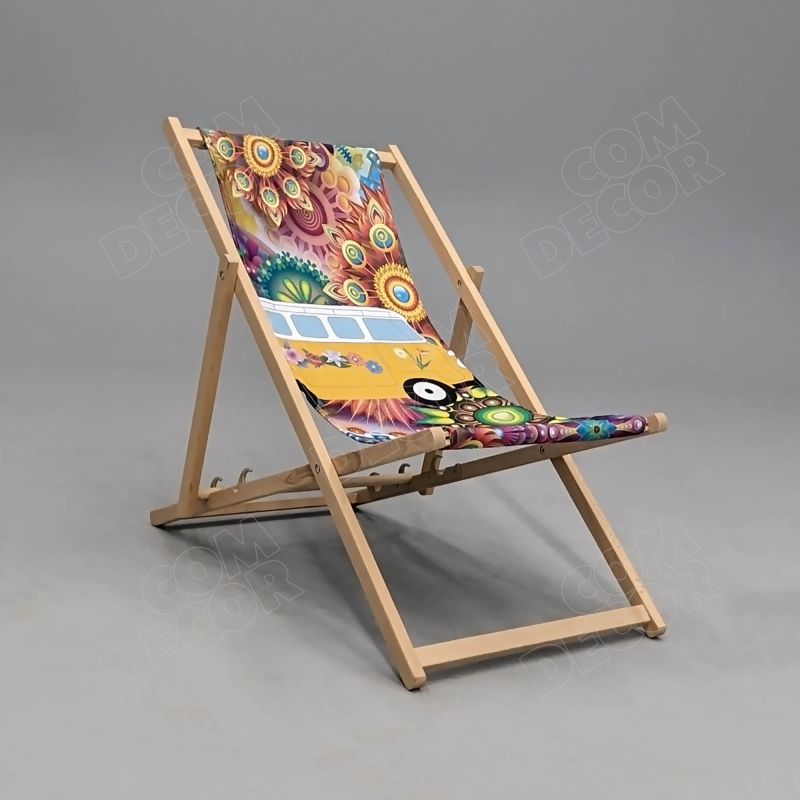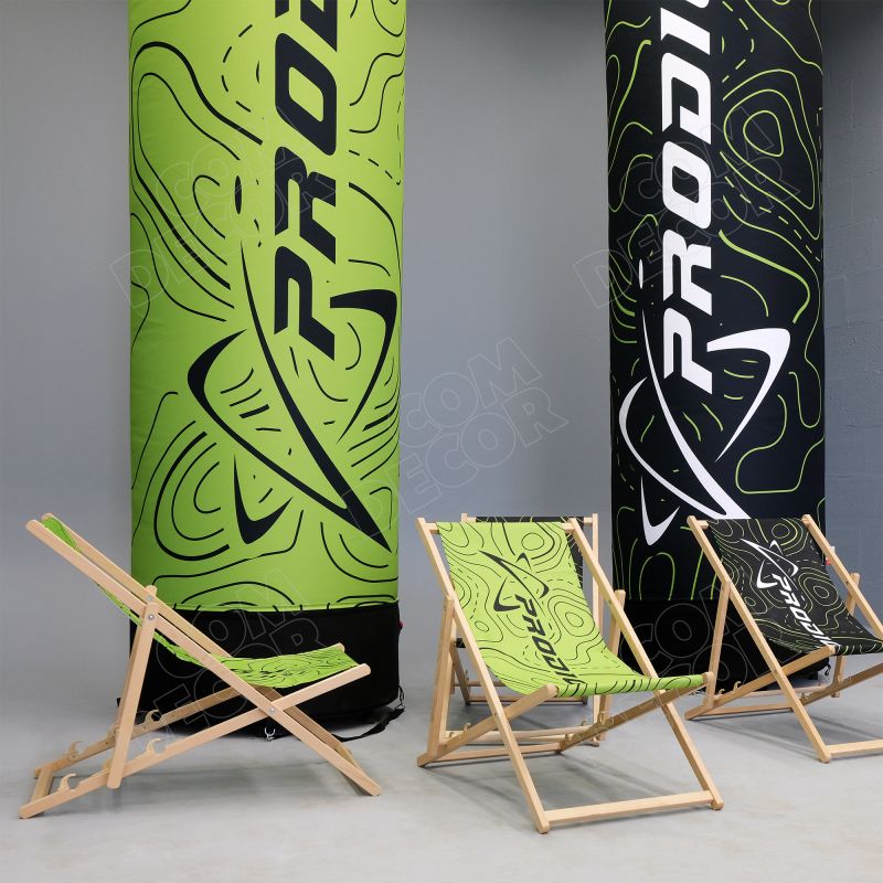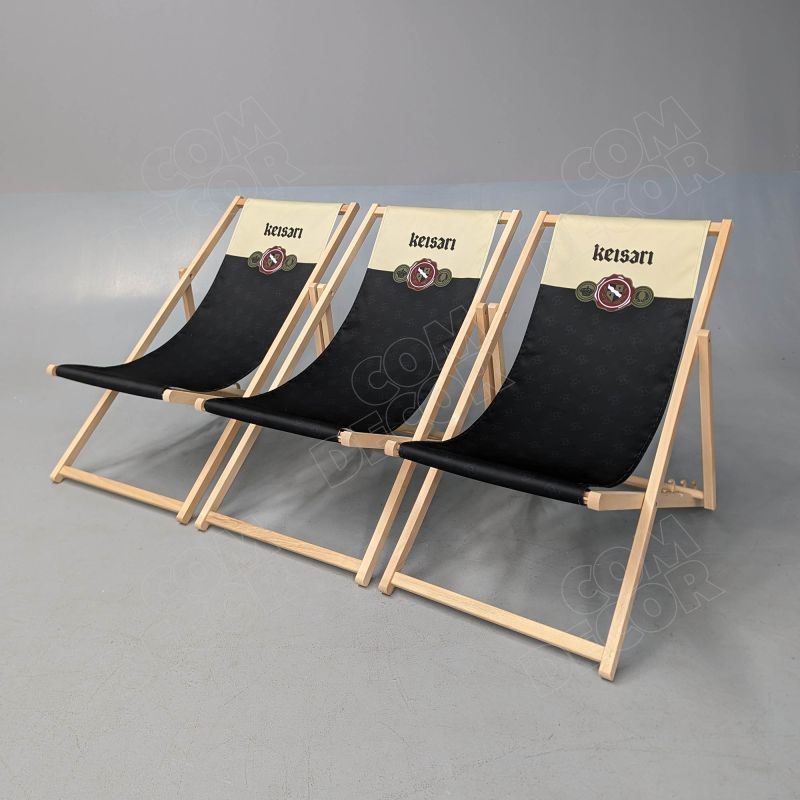 Puitraamiga ja kangast istmeosaga lamamistool. Kangale trükitakse kliendi kujundus või bränding. Lamamistooli kõrgus on reguleeritav.