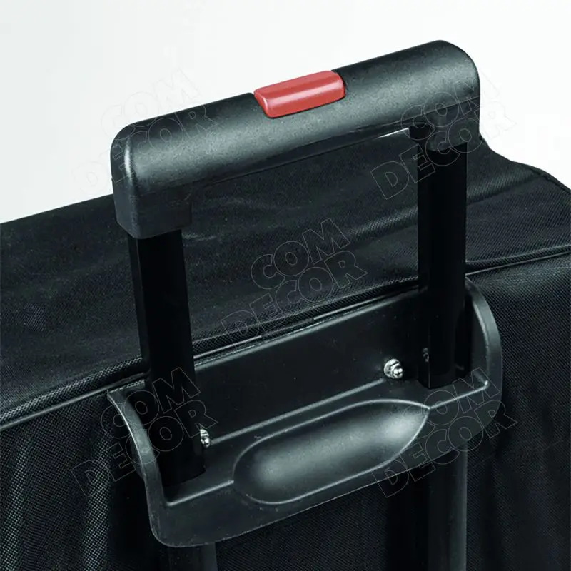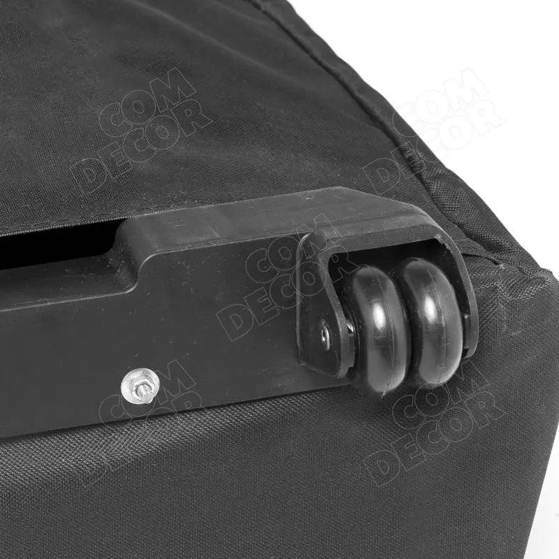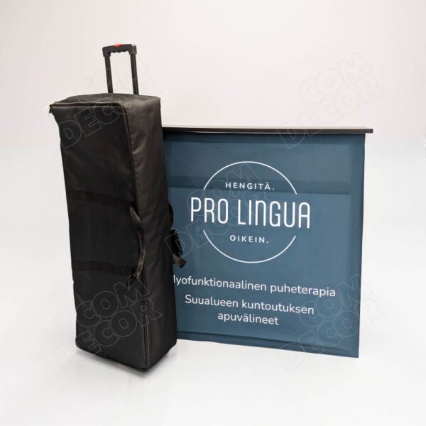 Komplekti kuulub reklaamlaud (raam, lauaplaat ja riiul), ratastega transpordikott ja trükitud graafikakangas.