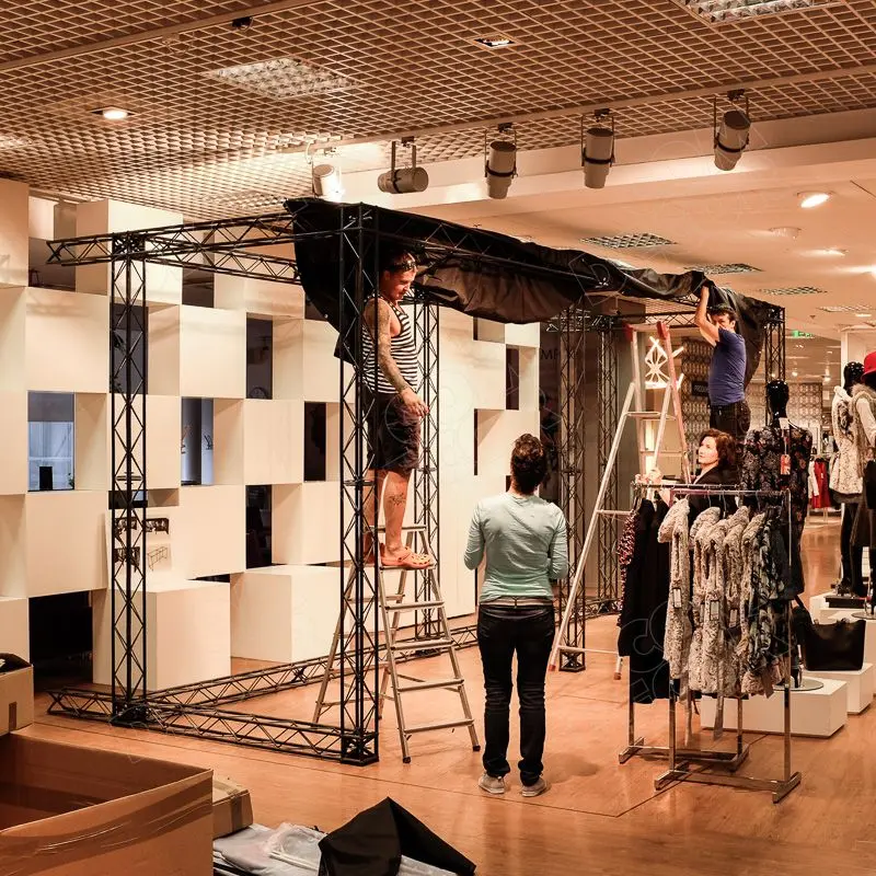 Komposiit-trussist ehitatud pop up pood. Vabalt valitud suuruse ja kujuga lihtsalt ülesehitatav konstruktsioon kaubandusse.