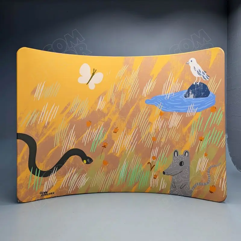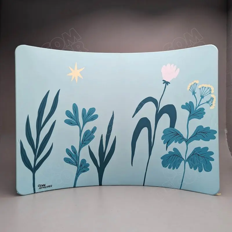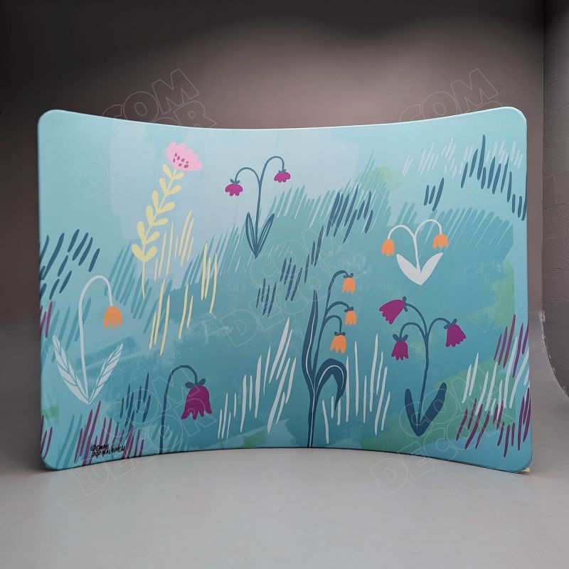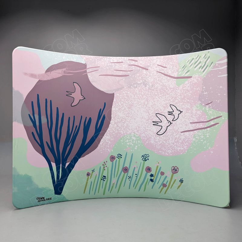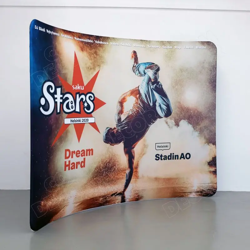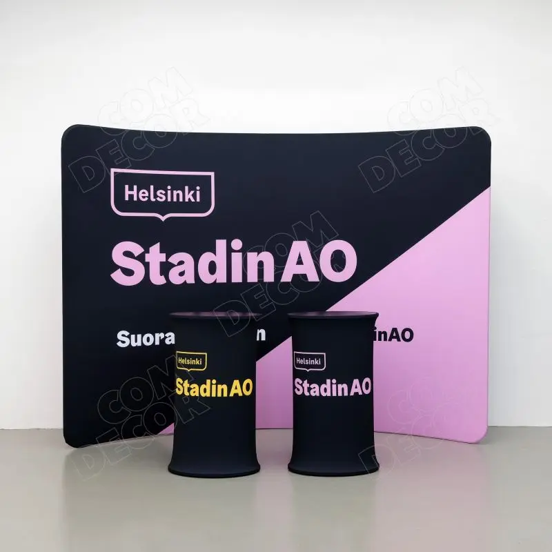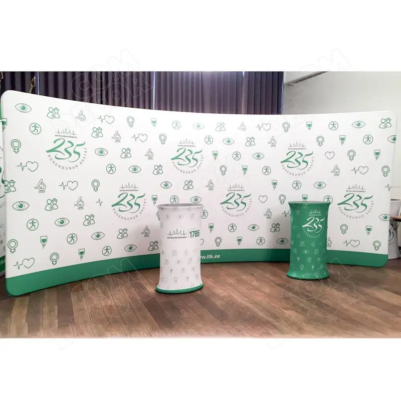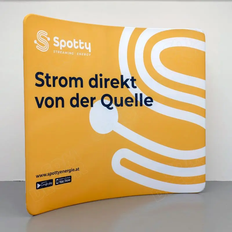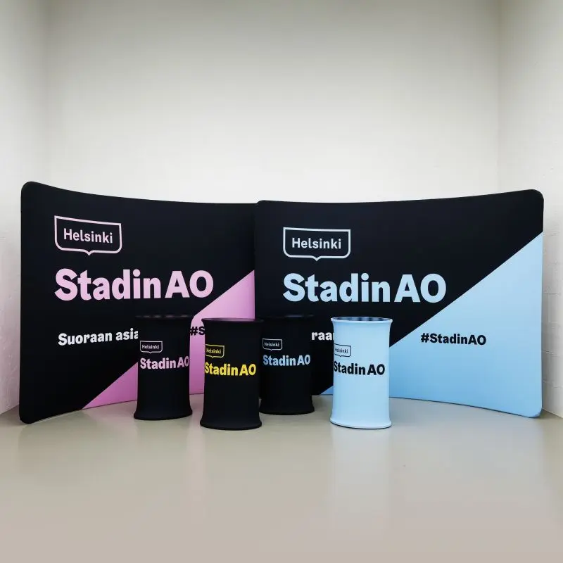 Kumer trükitud kangaga kaetud zipper-wall sein. Trükk on seina mõlemal küljel. Soodne, ülikerge, pakitult väike ja lihtsalt paigaldatav stend asendab tavalised pop-up stendid.