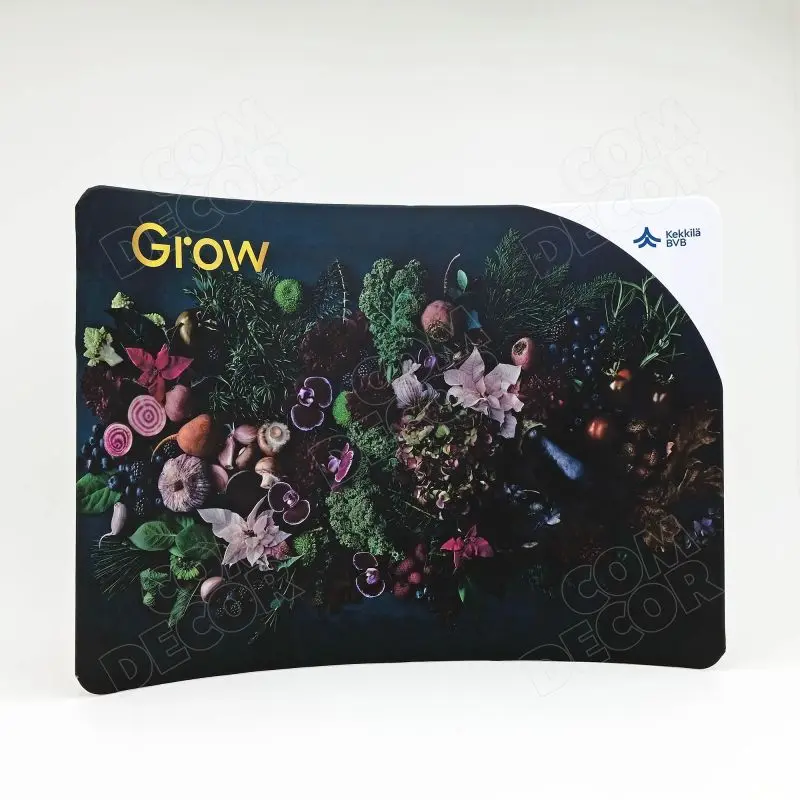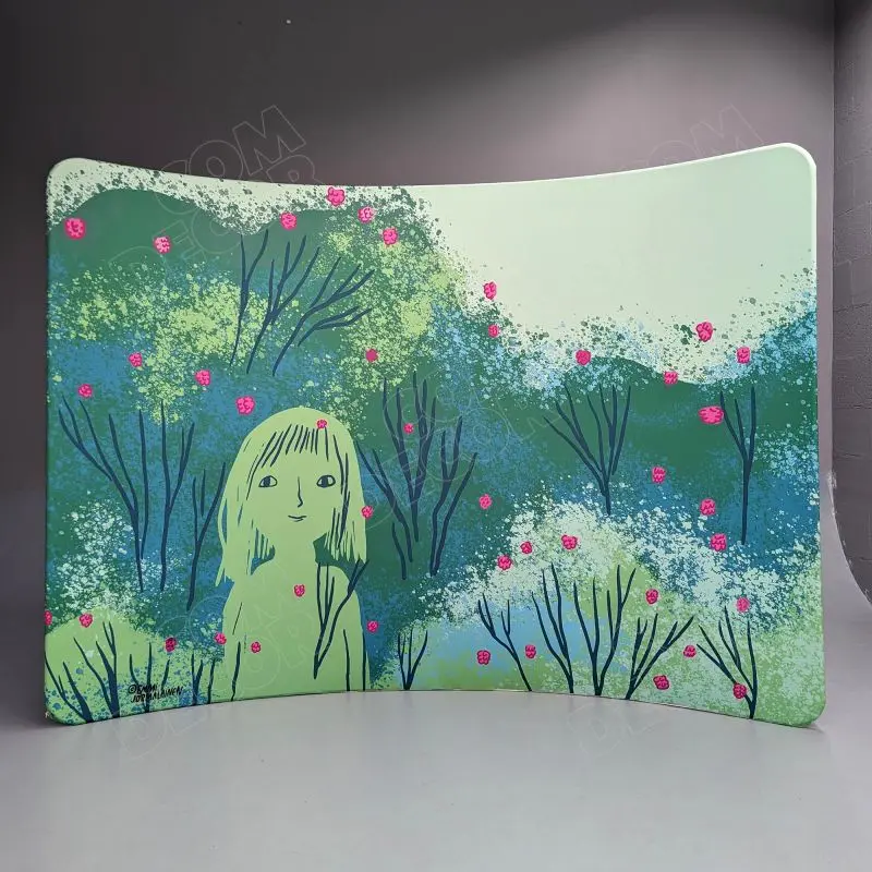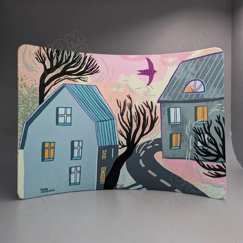 Trükitud tekstiil mõjub efektselt ja on esinduslik. Kumerad nurgad ja kanga alla täielikult peidetud raam mõjuvad uudselt ja kaasaegselt.