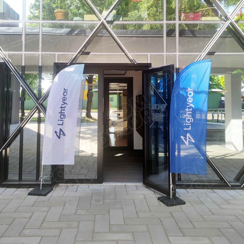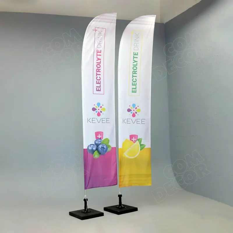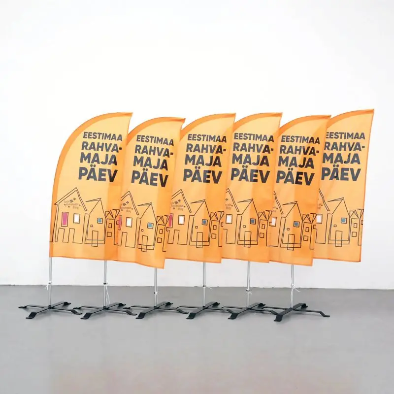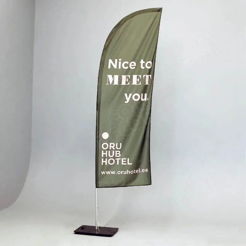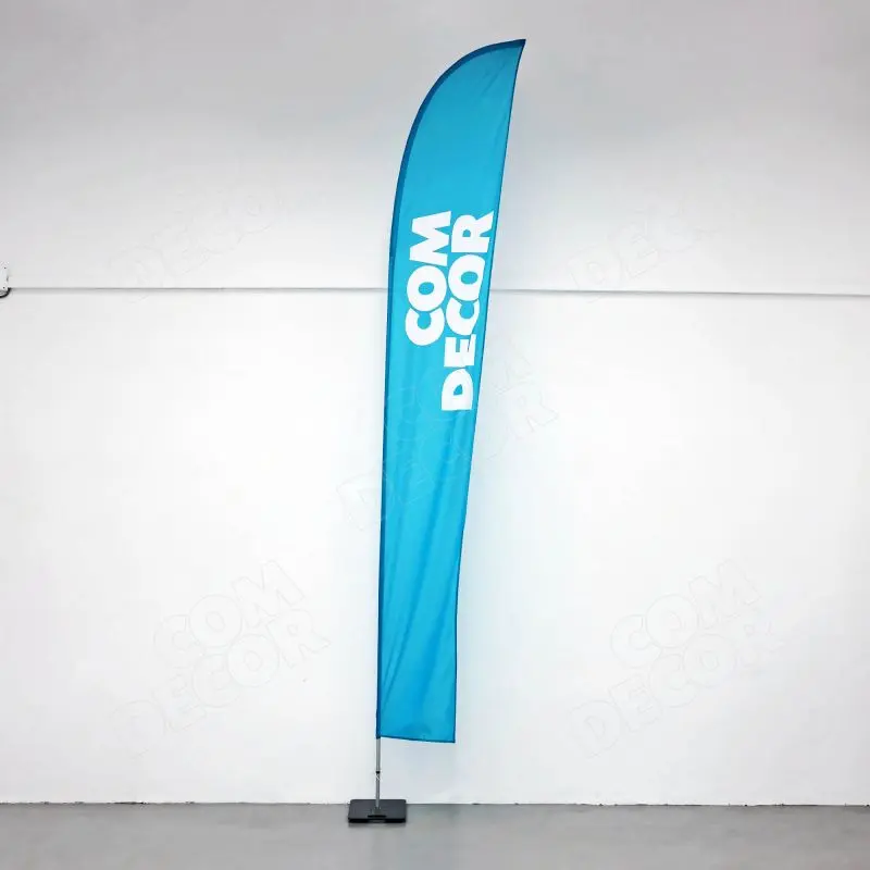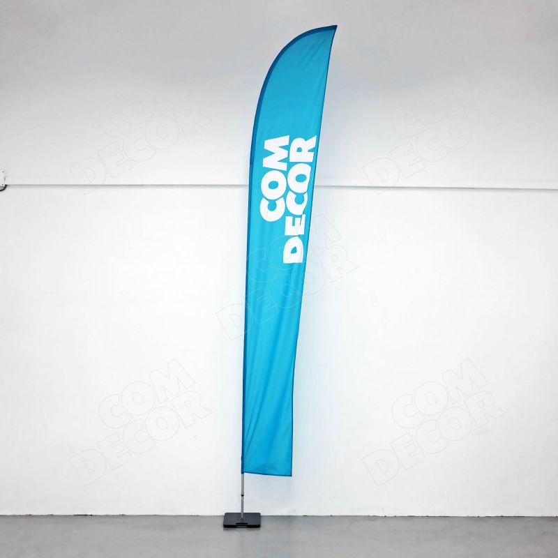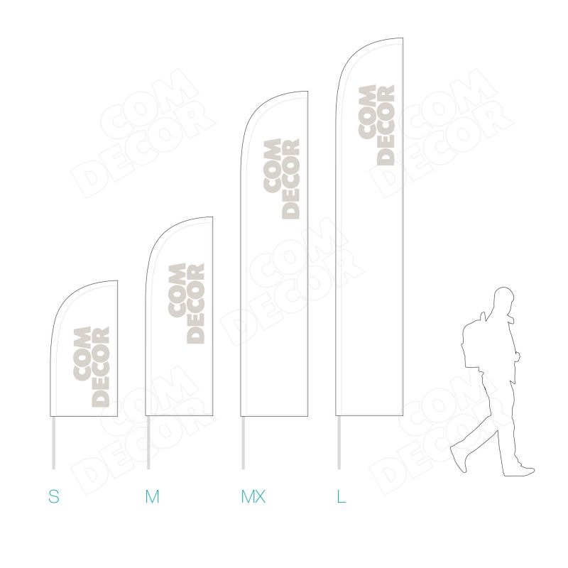 Haiuime-kujuline reklaamlipp (beach flag / rannalipp / surfilipp). Kõrgus maast 1,8 / 2,4 / 3,6 / 4,2 m. Lipu laius 64 cm.