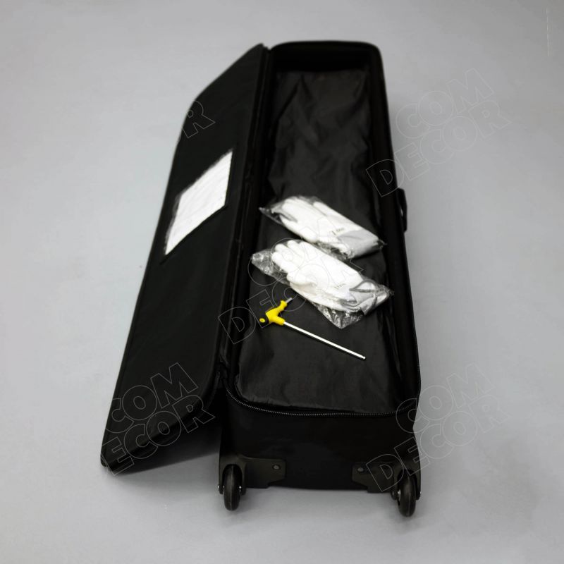 Pakitud stend kaalub vähe ning ei võta ruumi. Reklaamstend on pakitud ratastega kandekotti. Paigaldamiseks vajalikud tööriistad on komplektiga kaasas.