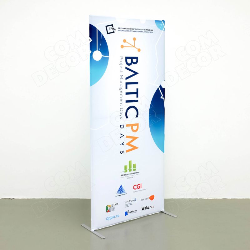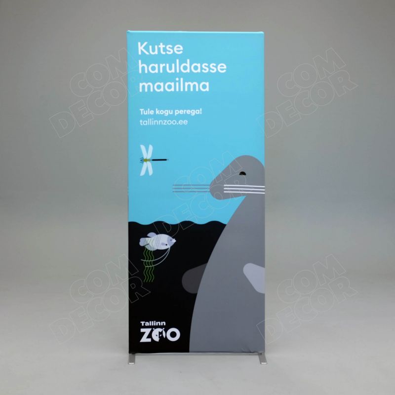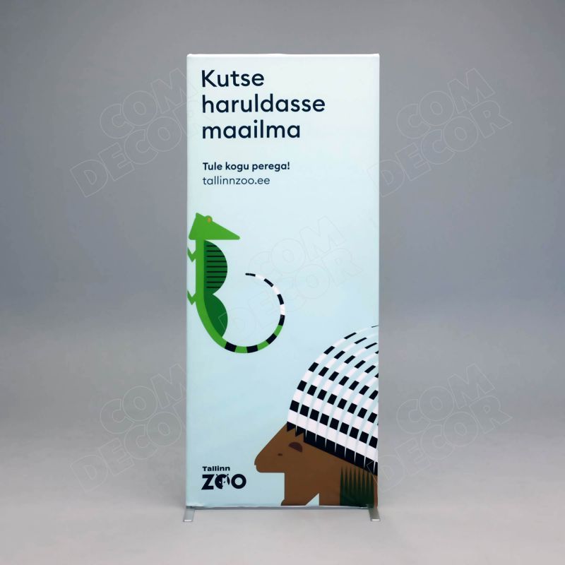Moodne ja ilus kangaga kaetud kahepoolne reklaamstend, mis asendab rollupid. Lihtne kasutada mitut graafikat. Laius 80 cm / 85 cm / 100 cm, kõrgus 2 m.