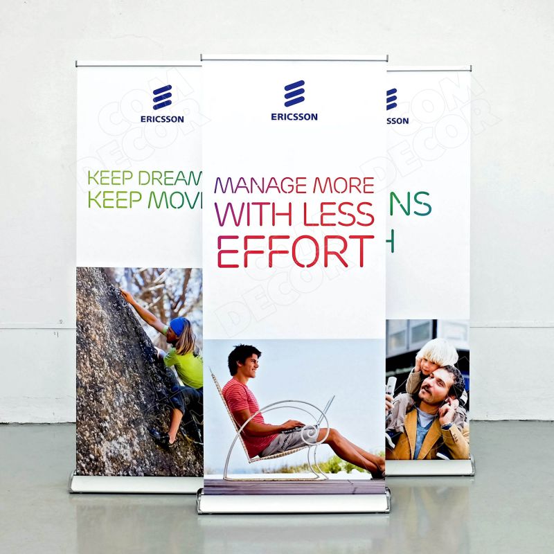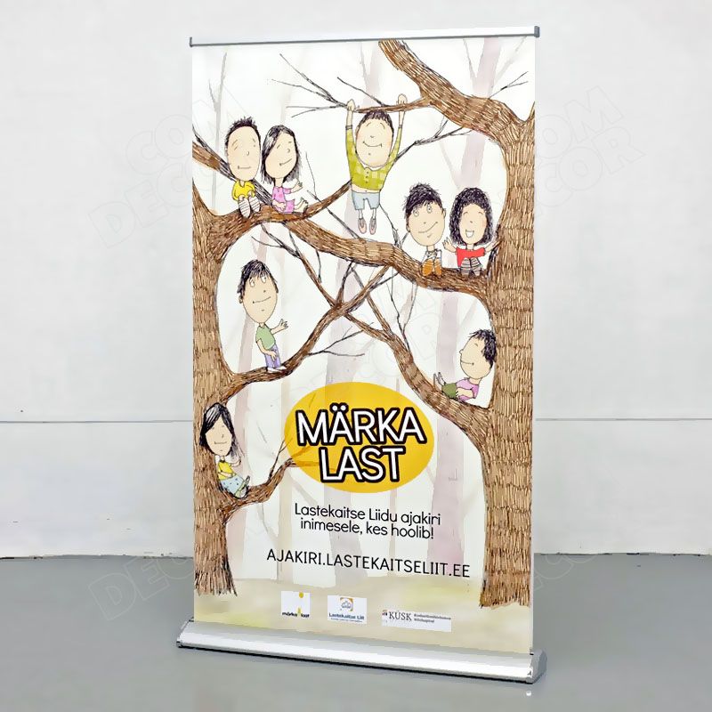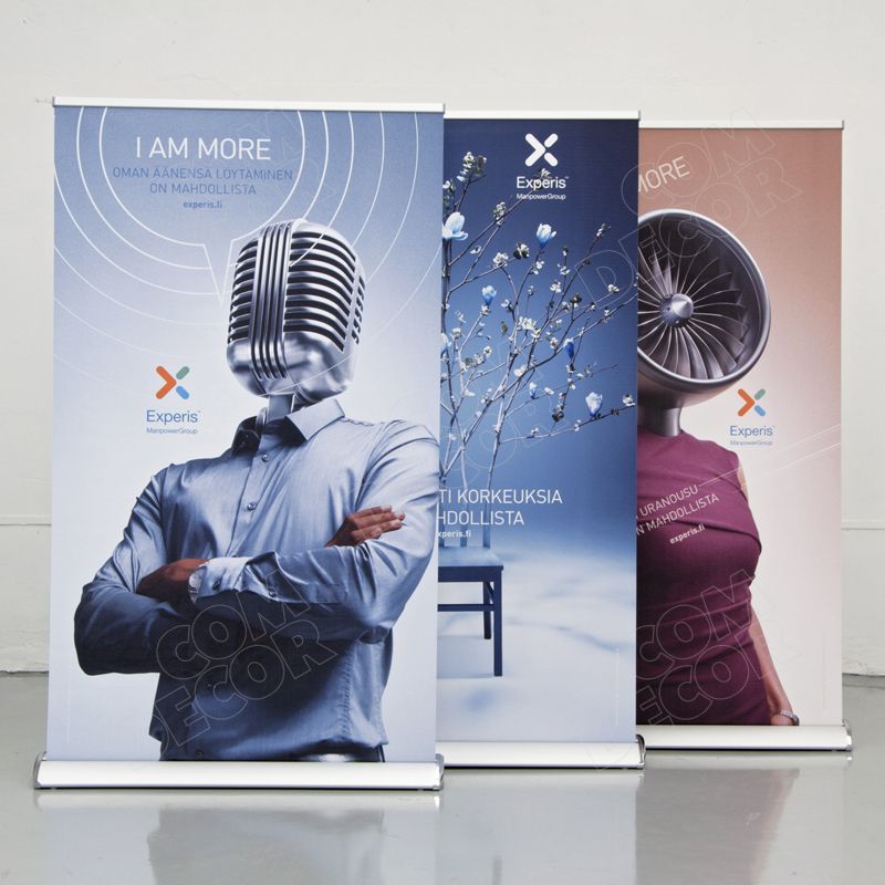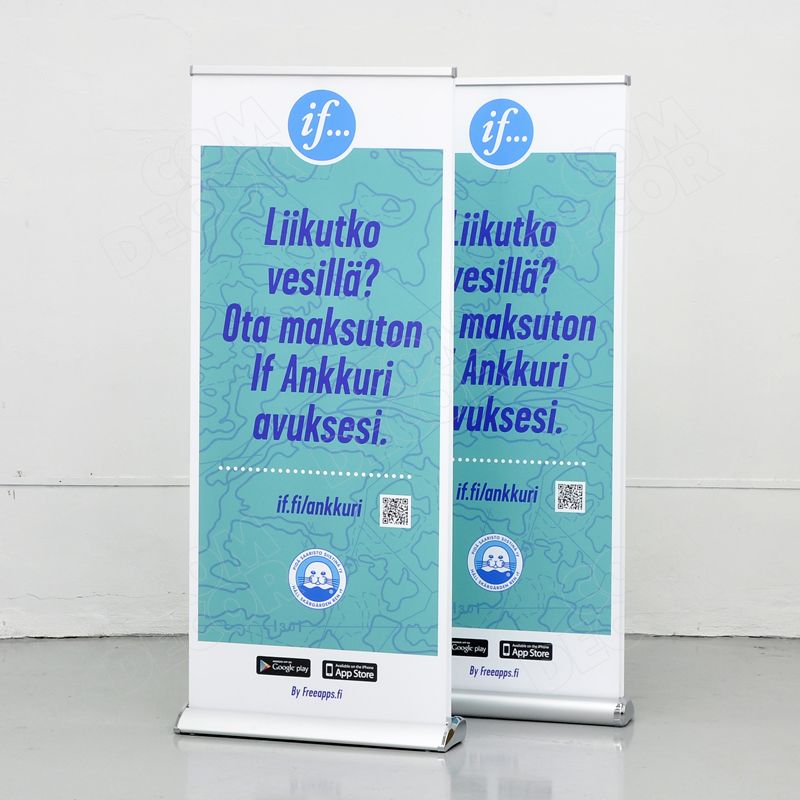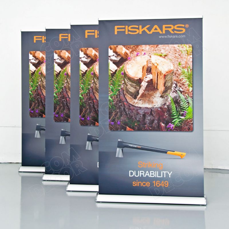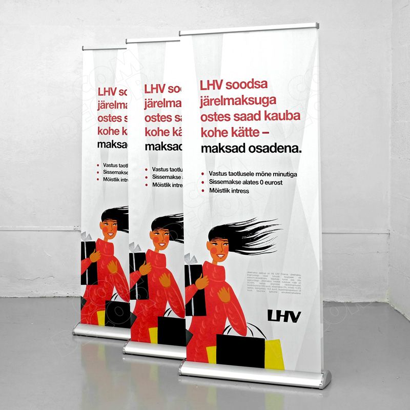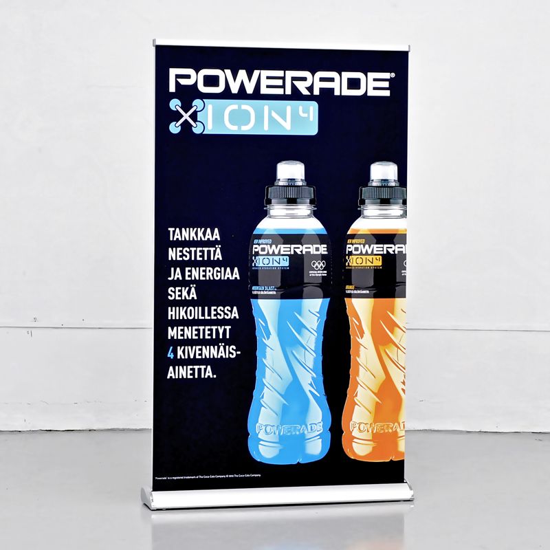 Stabiilne, esinduslik, vajadusel ebatasasele pinnale paigaldatav (regulaatorjalad). Kuna stendil on 2 roll-up bännerit, on reklaam nähtav kahele poole.