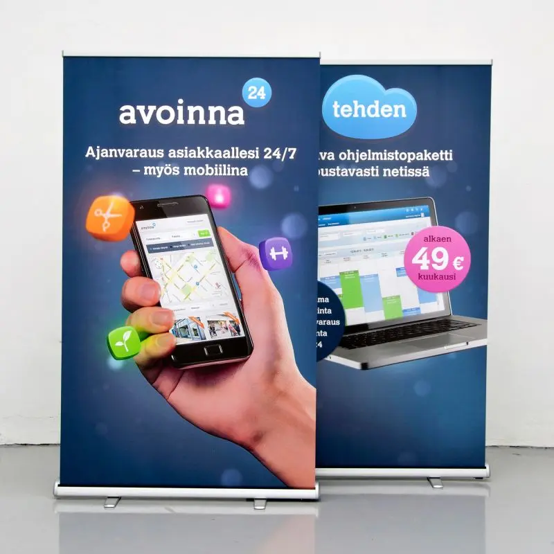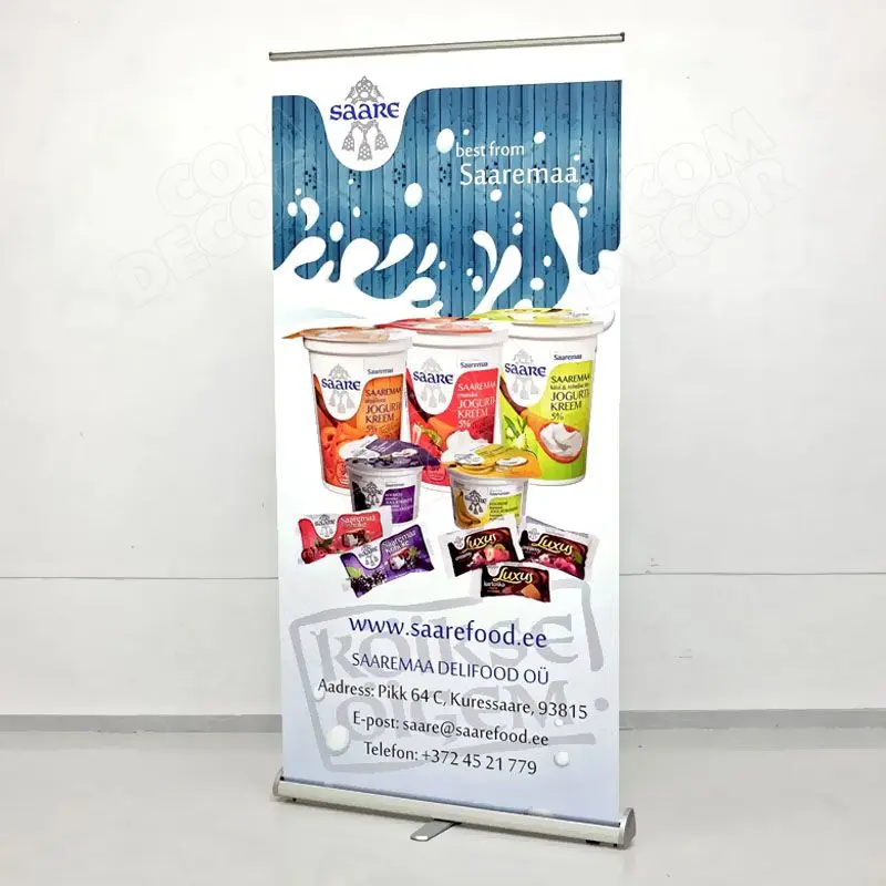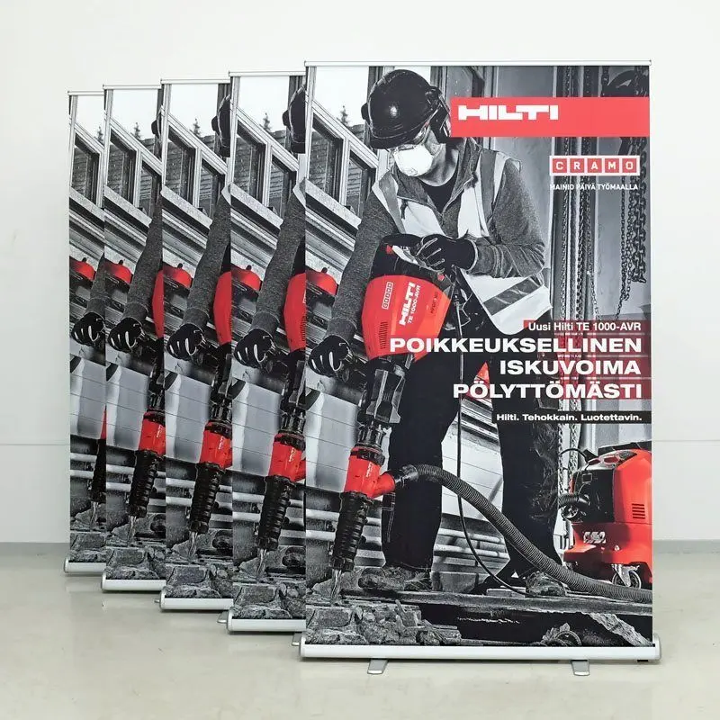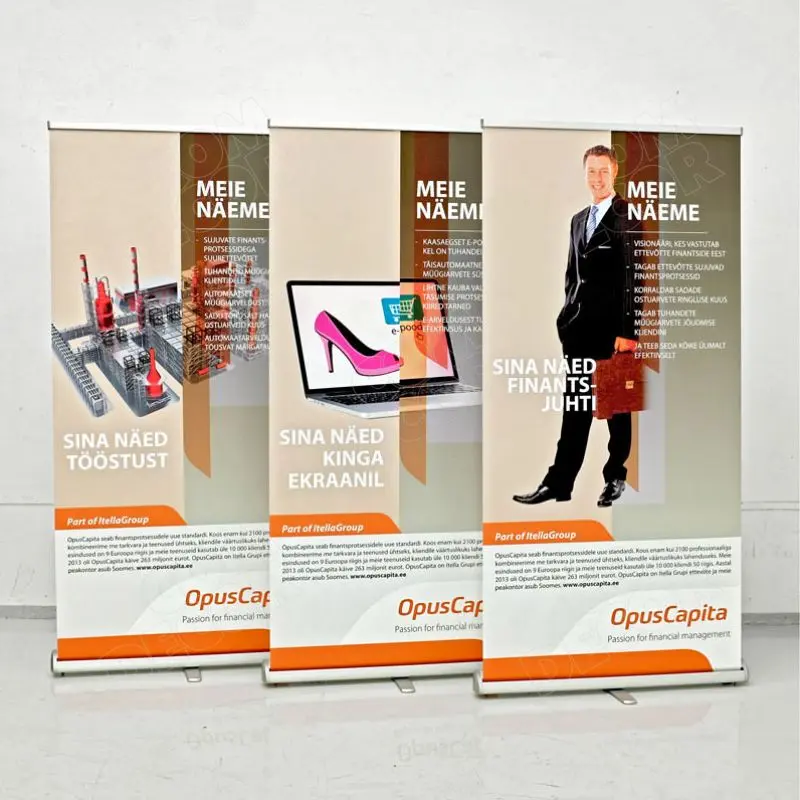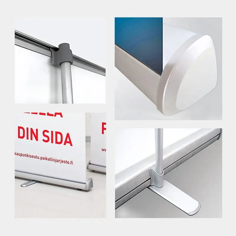 Eristuv, töökindel ja soodne kolmnurkse kerega roll up reklaamstend. Laius 85 cm / 100 cm / 120 cm.