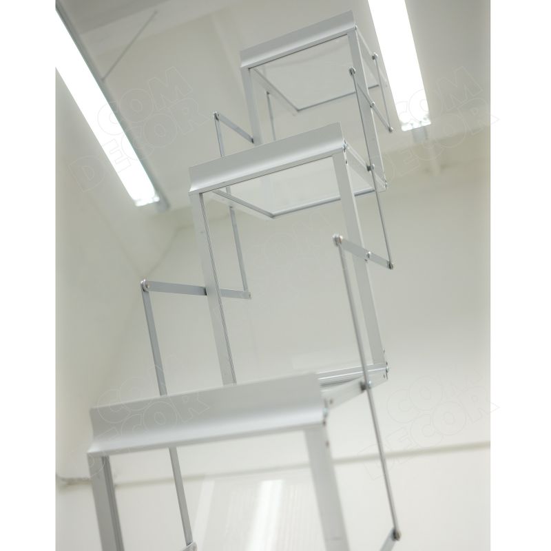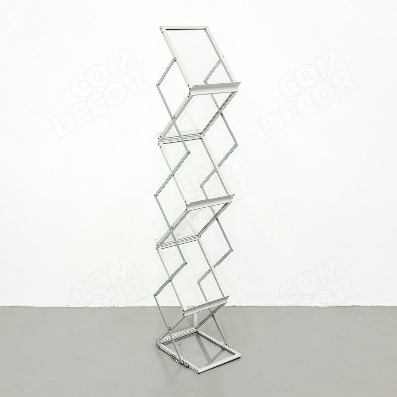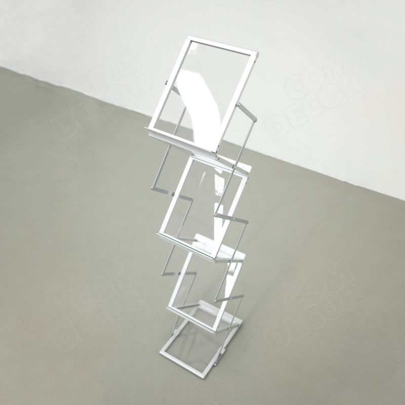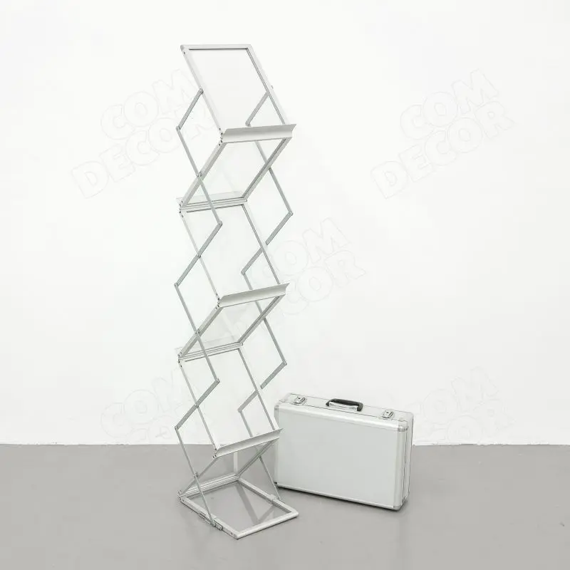 See on modernse disainiga kaasaskantav kataloogihoidja (brošüürihoidja, voldikuhoidja, bukletihoidja). Reklaamriiulid on akrüülklaasist, lõõtskonstruktsioon alumiiniumist. Trükisehoidja on väga lihtsalt kokku käiv ja kohvris transporditav.