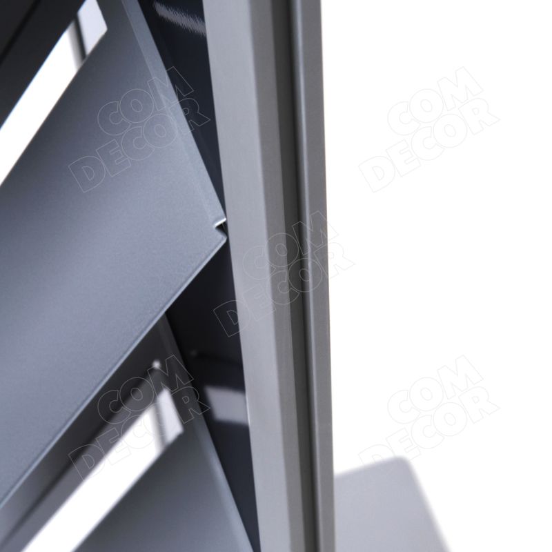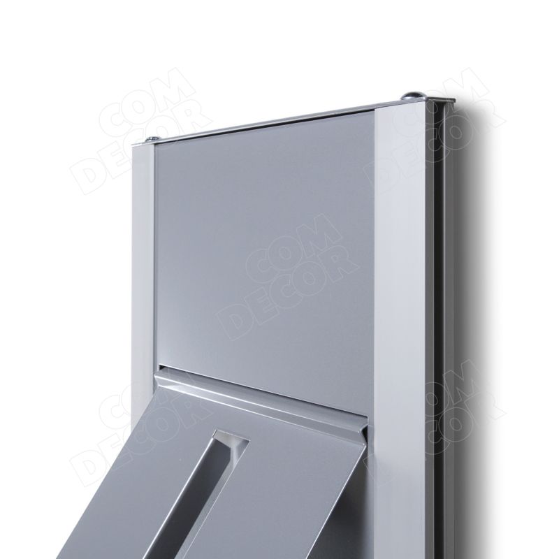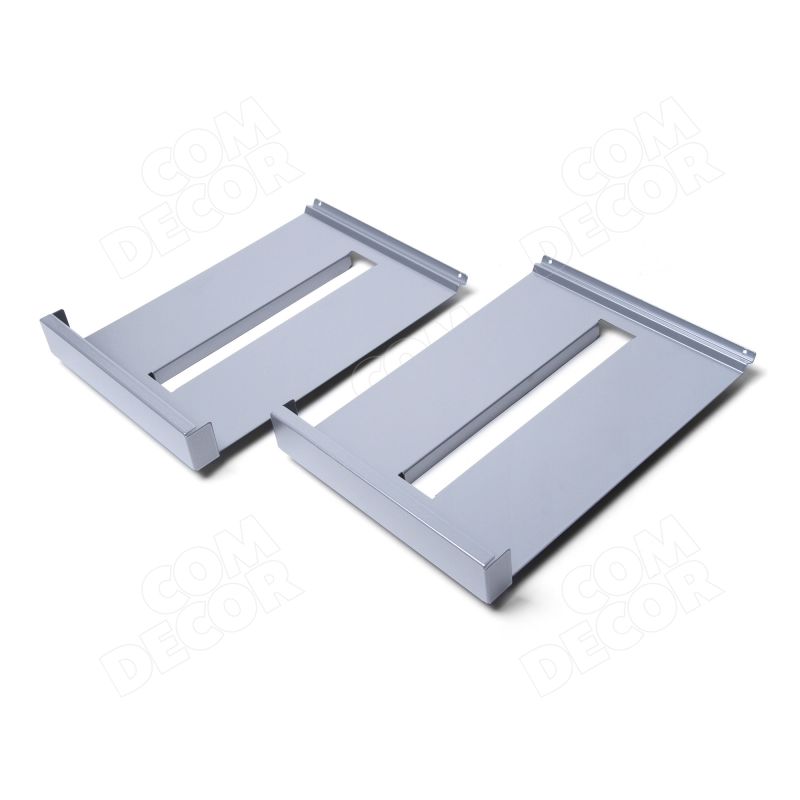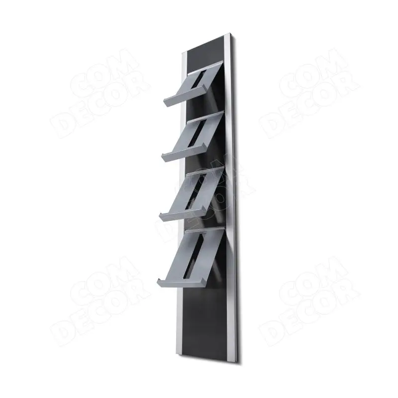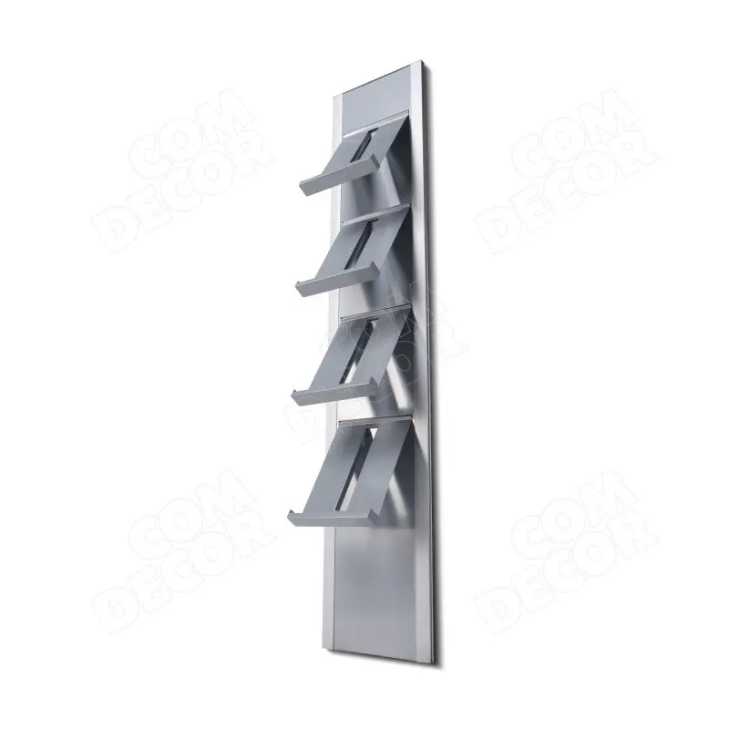 Väga kvaliteetse viimistlusega trükisehoidja, mille korpus on valmistatud alumiiniumist ja pulbervärvitud terasest ning on kahevärviline. Valikus on 2 tooni hõbedane või hõbedane + must versioon. Esiküljele saab kinnitada 4 pulbervärvitud terasplekist trükiseriiulit.