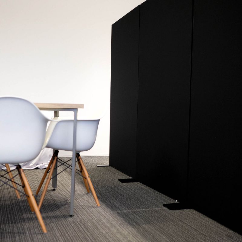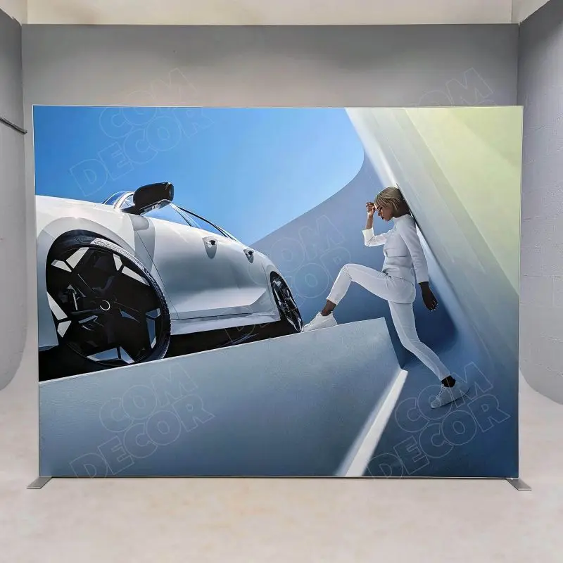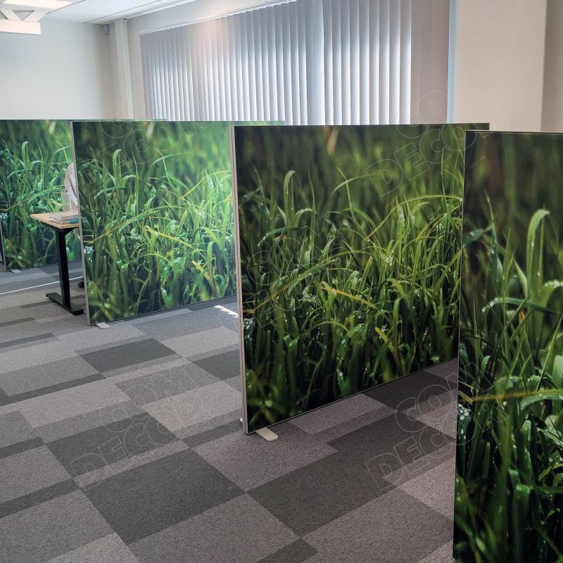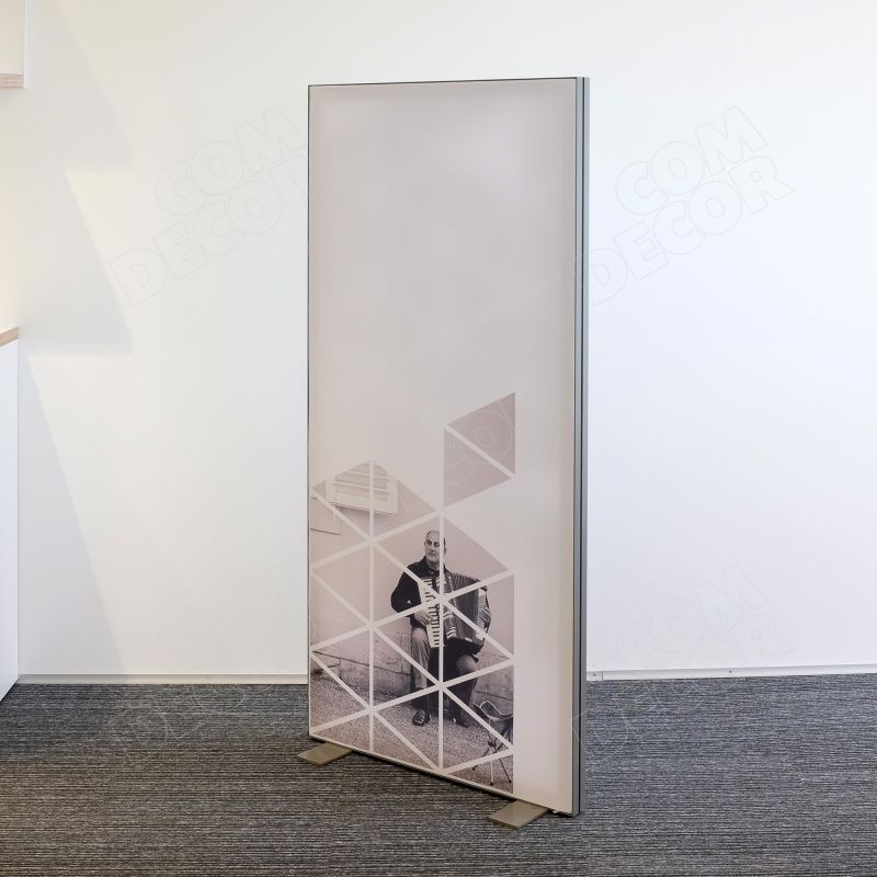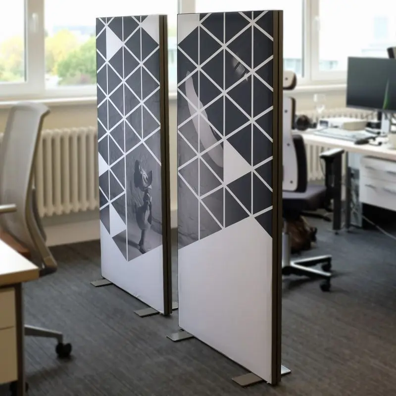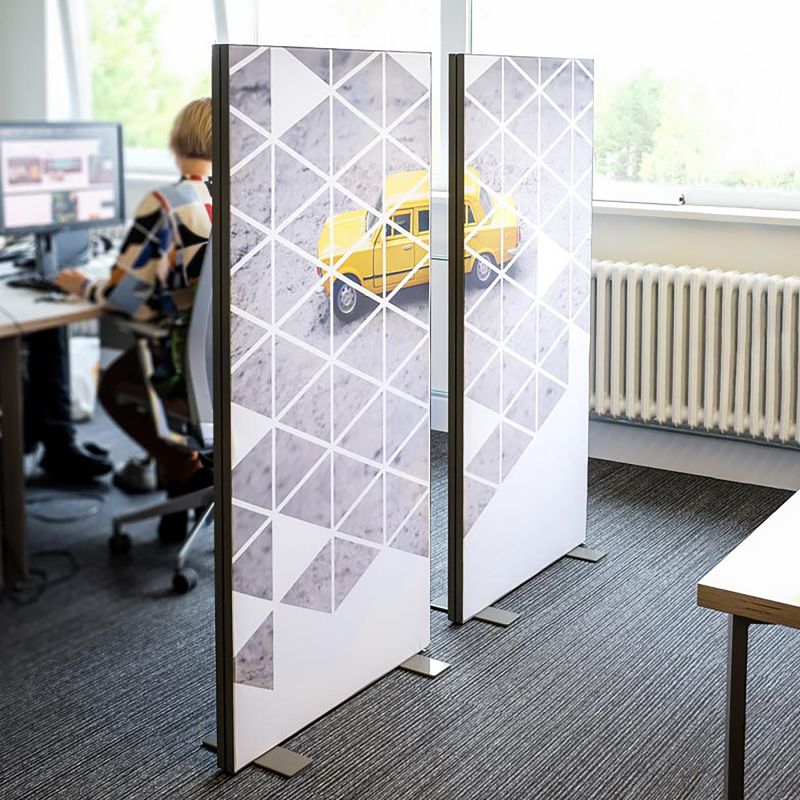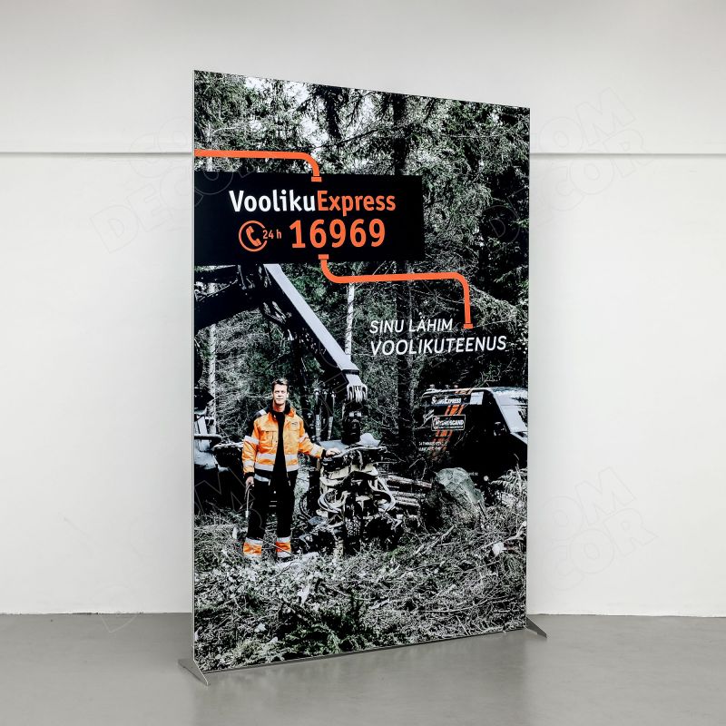 Mõõdu järgi valmistatud kerge vahesein kontorisse ja äriruumi. Seina katvale kergesti vahetatavale tekstiilkangale trükitakse kliendi kujundus.
